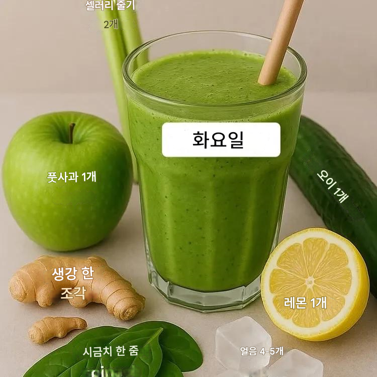 화요일 스무디는 디톡스·소화·면역 강화를 중심으로 설계된 레시피입니다. 풋사과·레몬으로 상큼하고, 셀러리·오이·시금치로 해독과 혈압 조절 효과가 있으며, 생강이 소화를 보조해 몸을 가볍게 해주는 클렌징 스무디라 할 수 있습니다.