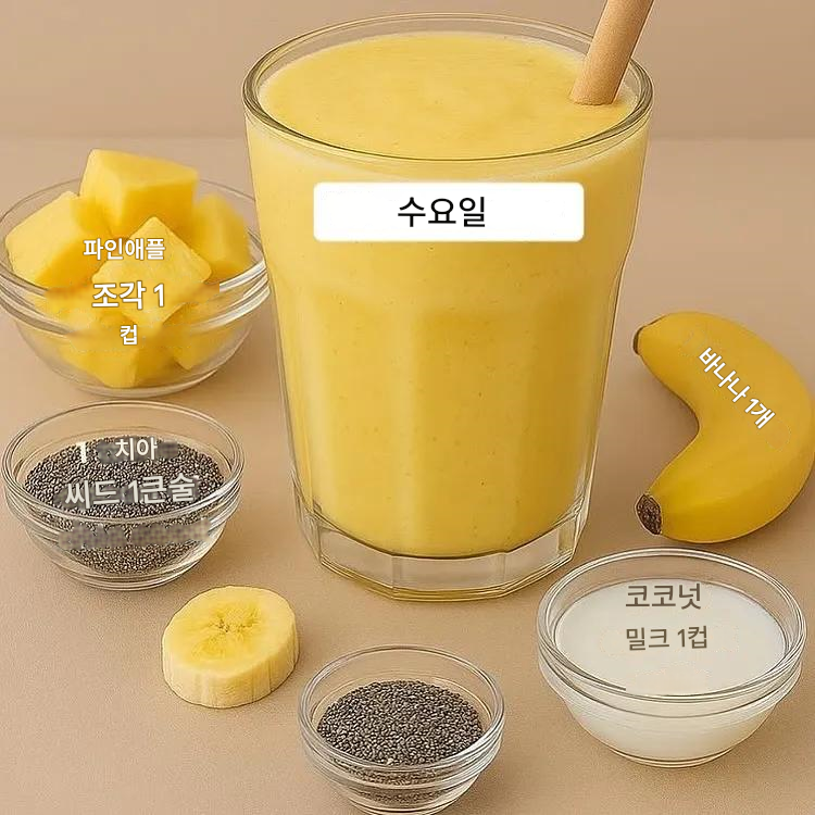 수요일 스무디는 소화 촉진 + 에너지 보충 + 장 건강에 최적화된 레시피입니다. 파인애플의 효소와 코코넛 밀크의 MCT가 활력을 주고, 치아시드와 바나나가 장 건강·심혈관 보호·면역 강화까지 보완하는 균형 잡힌 스무디입니다.