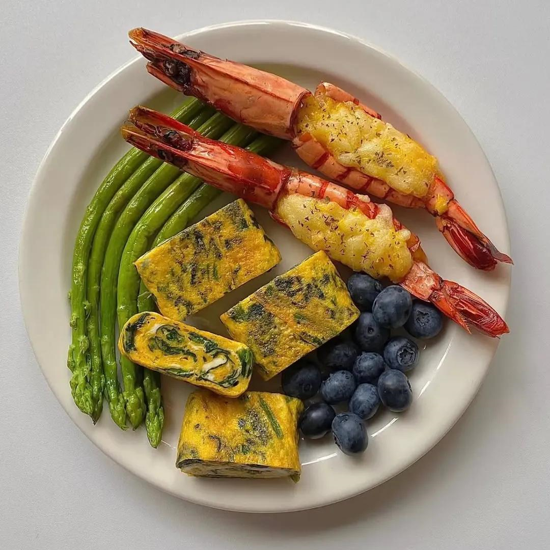 구운 새우 + 시금치 계란말이 + 아스파라거스 + 블루베리로 구성된 고단백·항산화 건강식입니다.
