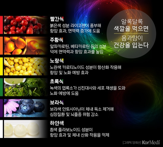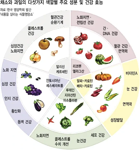여러 색깔의 과채류를 골고루 섭취함으로써 각 색이 가진 기능성 성분의 상호 보완적 효과를 충분히 누릴 수 있습니다.kormedi+2