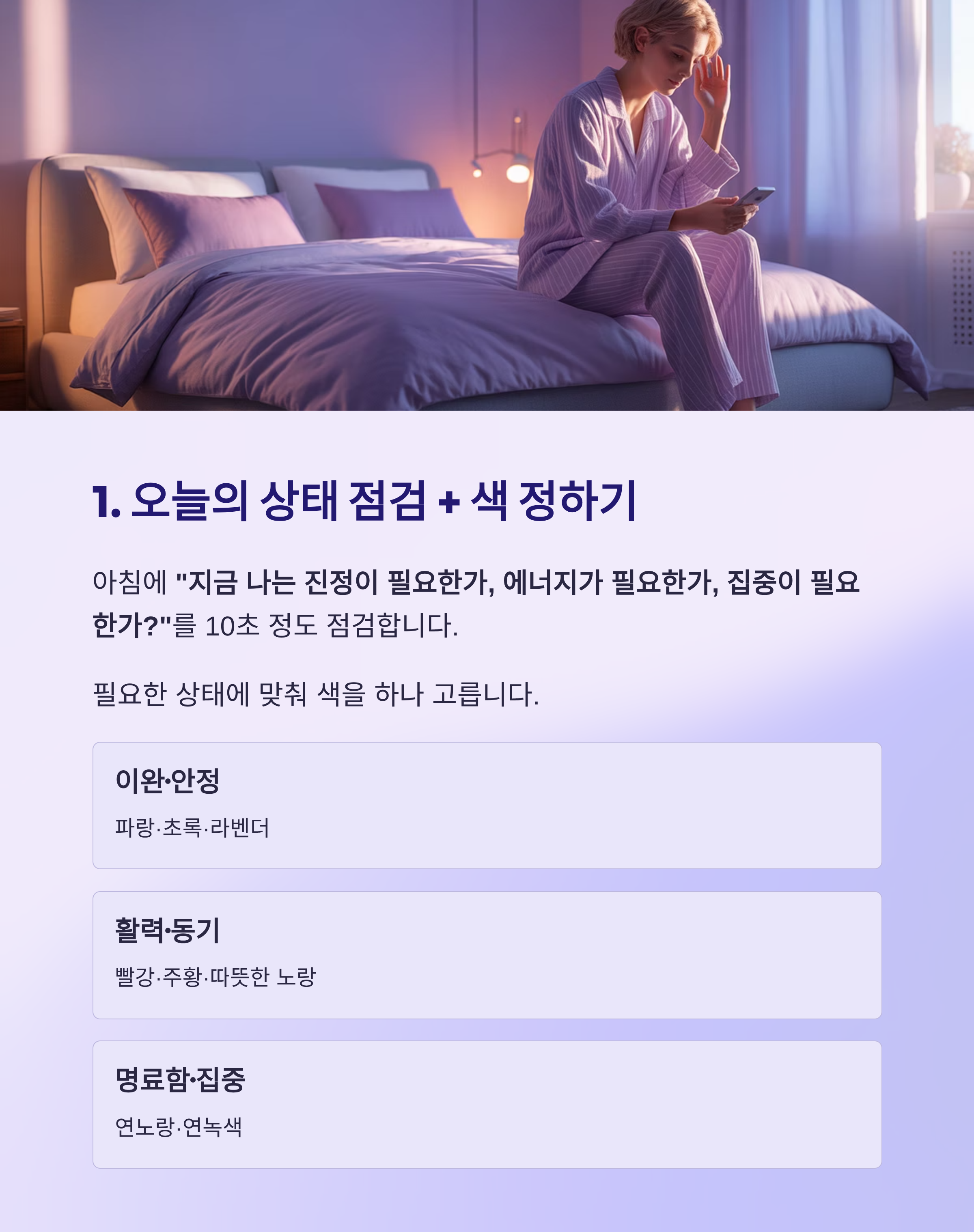 - 조명: 저녁에 20–40분, 약한 푸른빛 또는 연보라 간접조명 아래에서 호흡·명상.naver+1