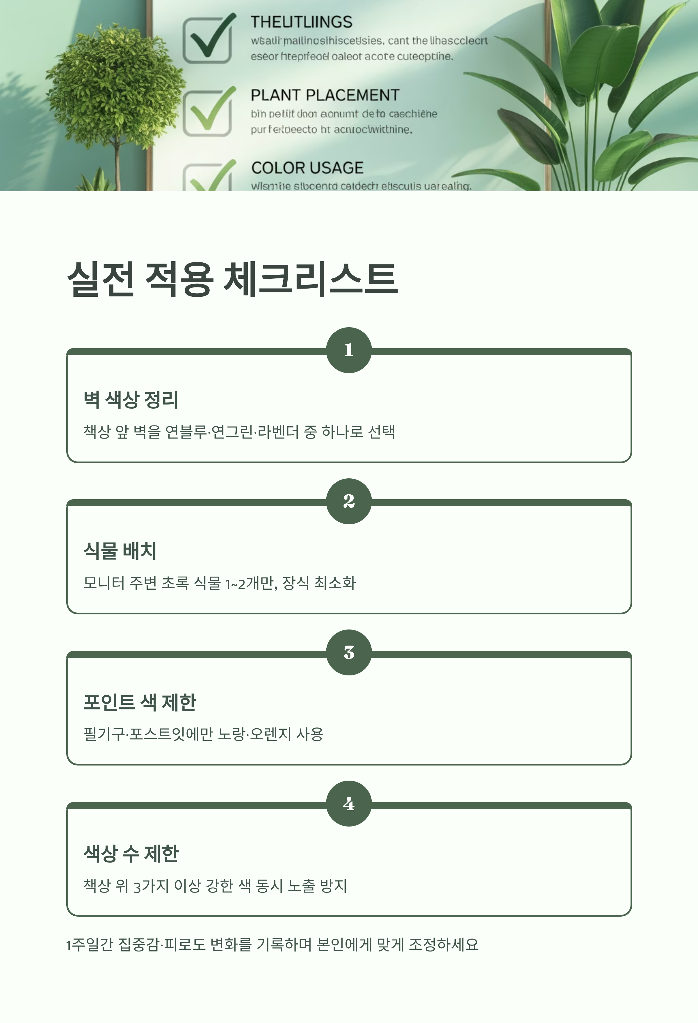 이런 색 구성은 “흥분시키기보다 마음을 길게 붙잡아 두는 환경”을 만드는 데 목적이 있으므로, 실제로 적용한 뒤 1주일 정도 집중감·피로도 변화를 기록해 보면서 본인에게 맞게 톤과 색 비율을 조정해 나가면 좋습니다.naver+1