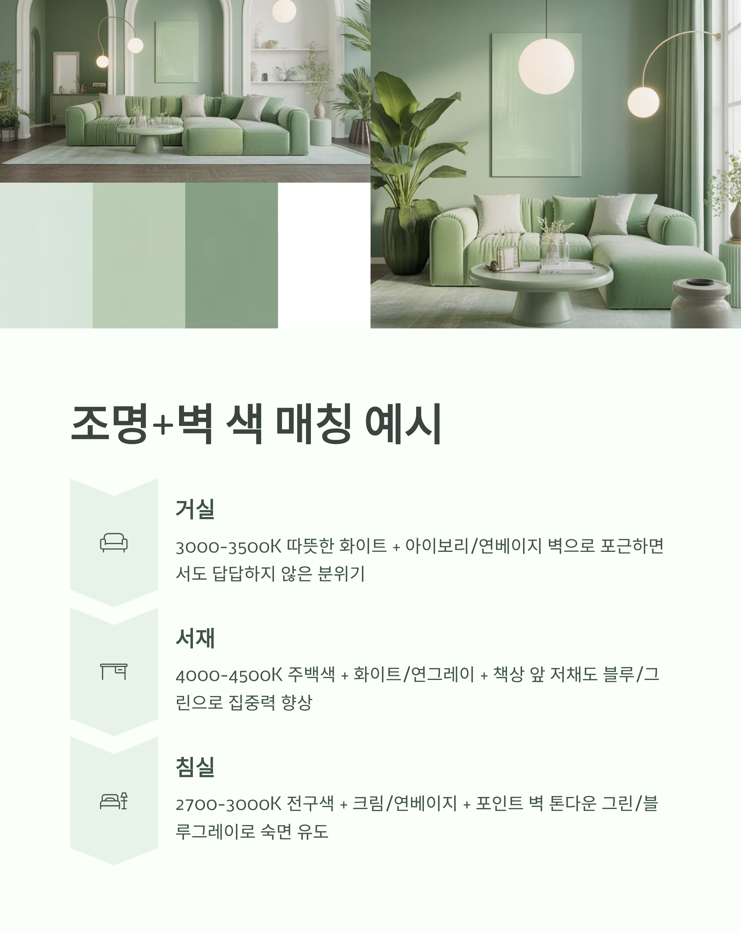 - 침실: 2700–3000K 전구색 + 크림/연베이지 + 포인트 벽에 톤다운 그린/블루그레이